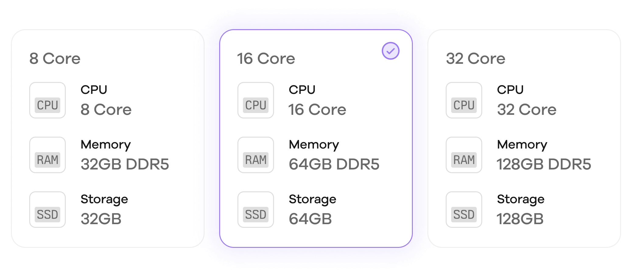 Spin up powerful containers in seconds. Choose a new machine from the cloud that’s preconfigured for your project and the programming environment of your choice.